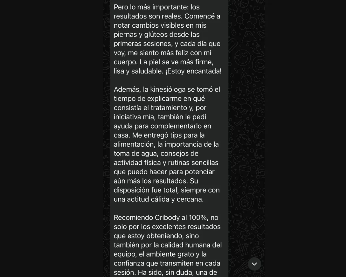 A lo largo de su trayectoria, ha trabajado con decenas de mujeres que buscan soluciones efectivas para moldear su cuerpo, reducir grasa localizada, tratar la celulitis y mejorar la firmeza de su piel, siempre priorizando la seguridad, el bienestar y resultados naturales.